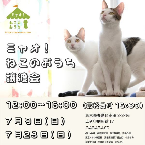 | イベント内容 | 参加する保護猫ちゃんについては、譲渡会一週間程前からホームページにてご確認いただけます。 https://myaoneko.com/catS/ 事前予約はできません。 猫ちゃんをお世話することになるご家族皆様でお越しくださると嬉しいです。 譲渡会場でお会いしましょう♪ 【新型コロナウイルス対策について】 会場受付にて、以下の点をお願いする予定です。 ✿マスクの着用 ✿検温と消毒 ✿連絡先のご記入 御来場者多数の場合には入場制限を設けさせていただきます。 ※当日沢山のご来場者様がいらっしゃった場合、整理券をお渡しする事がございます。 会場内外で長時間お待たせする場合もございますが、ご理解くださいますようお願い致します。 結果のご連絡は、当日夜〜翌日夜までの間に、お電話もしくはメールにて保護主より直接ご連絡いたします。 ◇譲渡に関してのお願い 【ミャオ!ねこのおうち】では譲渡に際して、以下の要件をお願いしております。 ・完全室内飼いで終生愛育 ・脱走させないための対策 ・不妊去勢手術 ・譲渡誓約書の取り交わし ・医療費の一部ご負担 ※60才以上の方のみのご家庭、独身や、経済的に困難な世帯、 必要な脱走対策を施していただけない方には原則的に譲渡はご遠慮頂いております。 また、保護主により譲渡条件が異なる場合もございますので会場でご相談ください。 参加予定ねこちゃんは、急な体調不良などで不参加になる場合もございます。 【譲渡に関してのお願い】・【医療費の一部のご負担】・【譲渡までの流れ】など 詳しくは下記ホームページをご覧くださいますよう宜しくお願い致します。 ミャオ!ねこのおうち ホームページ https://myaoneko.com |