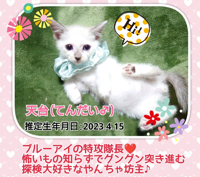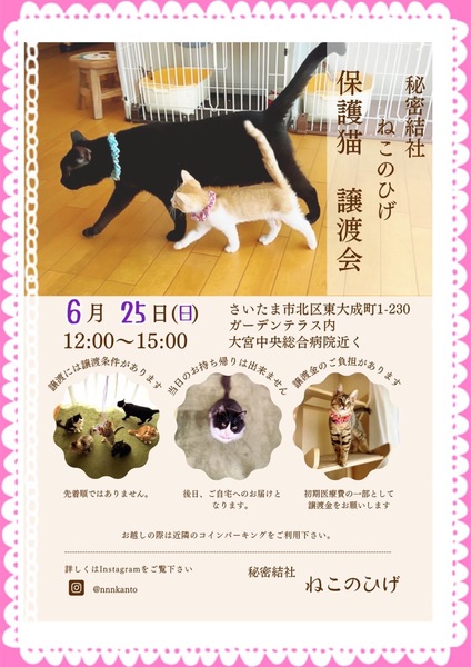 | イベント内容 | 【秘密結社ねこのひげ♡保護猫譲渡会】 6/25(日) 12:00~15:00 さいたま市北区東大成町1-230 金子建材内 ガーデンテラスにて開催します☆ とうとうやってきた! ワラワラ仔猫祭り♪ 2~3ヶ月齢のちびっ子ギャングや 2才までは子猫だにゃー!なヤング猫や まだまだ若いもんにゃ負けない!な オトナ猫たちがワクテカで参加します♪ 未来のご家族さまと 愛し愛されな 両想いになれますように♡ 家族にするなら保護猫だべ♪♪ こんなご時世だからこそ! 新しい家族と笑顔で暮らしたい♪ という方は是非会いにいらしてください♡ 新型コロナ対策として 受付名簿のご記入、消毒 マスク着用などのご協力をお願い致します。 物販の方も屋外スペースにて こじんまり置かせて頂きますので ご近所の方はふらりと是非 お立ち寄りくださいませ。 ご不明な点がございましたら インスタグラム @秘密結社ねこのひげ の DMまでお問い合わせ下さい。 |