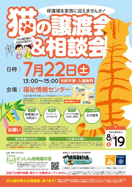 | イベント内容 | 7月22日(土)に「猫の譲渡会&相談会」を開催いたします。 猫少なめのミニ譲渡会&相談会です。 保護猫を迎えたい方はもちろん、猫に関する相談会も同時開催しておりますので、ご近所との猫トラブルなどでお悩みの方もお気軽にお立ち寄りください! 地域猫活動やペット防災についての展示もございます(^^)/ 【日時】2023年7月22日(土)13:00〜15:00 【会場】福祉情報センター(中央福祉センターとなり) 【主催】にっしん地域猫の会 【ホームページ】https://nissinchiikineko.main.jp ※重症化リスクの高い方々が多く利用される福祉センターの施設をお借りしているため、引き続き感染症拡大防止にご理解・ご協力をお願いいたします(受付名簿のご記入、室内の人数制限など)。 ※会場前に駐車場がございますが、数が少ないため、満車時は中央福祉センターの駐車場をご利用ください。図書館のむかいにある市役所の臨時駐車場もご利用いただけます。 ※室内換気のため冷房・暖房が効きにくい場合がございます。 ※ペット同伴のご入場はできませんので、予めご了承ください。 ※譲渡会に関しまして、福祉センターへのお問い合わせはご遠慮ください。 ※猫ちゃんの譲渡には条件がございます。詳細はホームページをご参照ください。 |