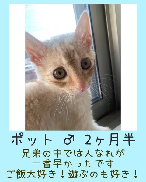 | イベント内容 | 元気いっぱいの子猫達も多数参加します♪ 【ペットショップへ行く前にぜひ譲渡会へ】 名古屋市の登録ボランティアであり、多数の名古屋市動物愛護推進員が在籍中です 猫や譲渡についての質問にはベテランの愛護推進員がお答えいたします<(_ _)> ●会場は ・駐車場有(利用料300円) ・予約不要&入場無料 ●参加猫は ・子猫も成猫も全頭ワクチン接種済 ・ノミダニ駆除済 ・トイレ躾済 ・ケージレストのトレーニング済 ●参加する猫たちについて 基本治療やトイレのしつけは済んでいます 足りないのは共に生きる新しい家族だけです 「譲渡会は行ったことがなくて不安…」 「猫を飼うのははじめて」 「今すぐじゃないけどいずれ猫と暮らしたい」 そんな皆様も大歓迎! ●譲渡に関して ※完全室内飼い・誓約書・治療費負担等の 諸条件があります。 ※譲渡やトライアルに関する契約条件は 猫の保護主によって異なります。 ●譲渡会その他についての問い合わせは みなと猫の会 minatonekonokai@gmail.com までお願いします。 ♪参加猫ちょこっと紹介 写真2枚目 ポット♂2ヶ月半 人なれバツグンの食いしん坊さんです その他参加猫など詳しくは主催者ブログ ・みなと猫の会 ~こぴっと猫だより~ http://minatoneko2014.blog.fc2.com/ |