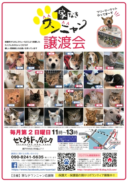 | イベント内容 | ★コロナ対策のため、ボランティアは全員マスク着用にて対応させて頂きます。 ご来場くださる方も、申し訳ございませんが、マスク着用にてお願いいたします。 また、入り口にアルコール消毒液を用意しますので、会場への入退場の際には必ずアルコール消毒をお願いいたします。 発熱のある方、体調の悪い方については、ご来場の自粛をお願いします。 時間帯によってはお待たせすることがあります。大変申し訳ありませんがご理解、ご協力の程、宜しくお願い致します。 里親募集中の猫ちゃん。 →http://ienakiwan2018.blog.fc2.com/blog-category-2.html 里親募集中の犬ちゃん。 →http://ienakiwan2018.blog.fc2.com/blog-category-7.html ★保護主さんの都合で13時までしか参加しない保護っ子もいます。また、全ての子が参加するとは限りませんので気になる子がおりましたらブログコメント欄からお問い合わせをお願い致します。 せとうちドッグパークさんへの行き方↓ https://www.dogcat-hogo.com/%E3%83%89%E3%83%83%E3%82%B0%E3%83%91%E3%83%BC%E3%82%AF/%E3%82%A2%E3%82%AF%E3%82%BB%E3%82%B9/ |