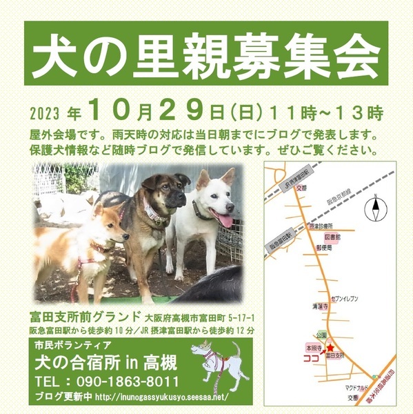 | イベント内容 | ※屋外会場での里親募集会です。雨天時の対応は当日朝までにブログで発表いたします。 (電話でのお問合せ→090-1863-8011) ※先住ワンちゃんを連れて会いに来て頂けます。相性を見るためにも、是非是非、連れてきてください。 ※参加犬は、近づきましたら「犬の合宿所in高槻」のブログで紹介していきます。 → http://inunogassyukusyo.seesaa.net/ 予約不要ですが、参加犬が直前に変更する場合がありますので、特に会いたいワンちゃんが決まっている場合は事前にご連絡ください。 【お問合せ】 090-1863-8011 ・・・・・・・・・・ 【アクセス】 ・阪急京都線 富田駅から徒歩約10分 ・JR京都線 摂津富田駅から徒歩約12分 ※会場の広場の中に駐車して頂けますので、車で来場される方は事前にご連絡ください。 隣接する富田支所と公民館の駐車場は使えません。 ・・・・・・・・・・ 市民ボランティア「犬の合宿所in高槻」は、殺処分数の多い地方の保健所収容犬を引き取り、関西で新しい飼い主探しをしています。 保護犬を飼うことが文化として定着することで生体販売に伴う悲惨な繁殖犬の存在がなくなることと、 地方の収容犬を人口の多い地域で引き受けることで全体として処分数が減ることを目指しています。 ・・・・・・・・・・・・・・・・・・・・・・・・・・・・・ ★ 一時預かりさんや犬の搬送ボランティアさん、里親募集会の当日お手伝いの方など常時募集しています。 ★犬によっては個別お見合いできる場合があります。 里親募集会に参加できない方で個別お見合いをご希望の方は、預かりさんとの日程調整が必要ですので、電話でお問合せください。⇒090-1863-8011 |