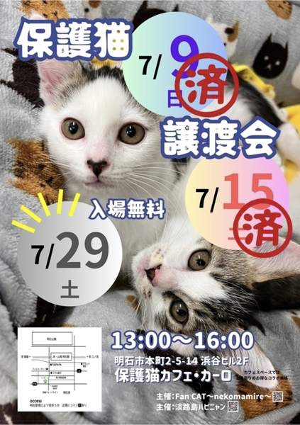 | イベント内容 | 猫の譲渡会 in 明石市 日時:7月29日(土)13時から16時まで(譲渡会参加は無料です) 場所:明石市本町2-5-14 浜谷ビル2階 保護猫カフェ・カーロ (お問合せはカーロさんにしないようにお願いします) たくさんの猫たちが参加しています 今回も2か月~くらいの子猫がたくさん参加しています♪ 本気で猫を飼いたい方是非ご来場ください 早い順ではございませんが早くに決まってしまう場合がございますので お早めにお越しいただくか面会予約をお願いします ※猫の譲渡は無料ではありません(譲渡会参加は無料です) ※当日連れて帰れません ※譲渡条件があります ●参加猫たちのお紹介やお問い合わせ(面会予約等)は ブログ、InstagramのDMよりご連絡お願いします https://mycatkobe.blog.fc2.com/ 主催:Fan CAT~nekomamire~ |