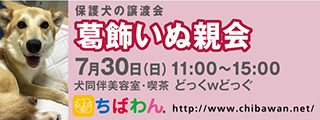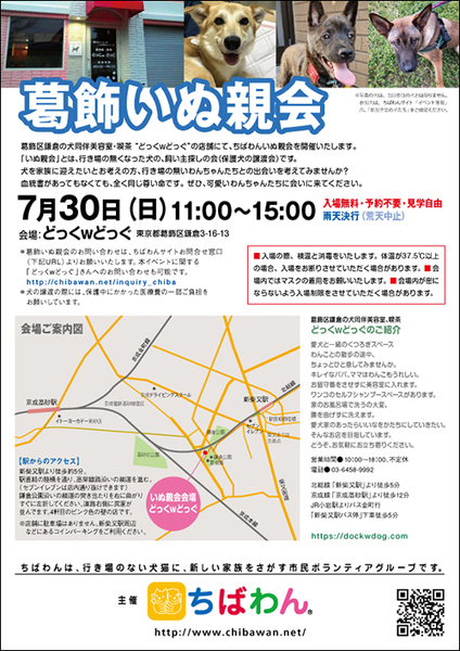 | イベント内容 | 葛飾区鎌倉のいぬ同伴美容室・喫茶“どっくwどっぐ”の店舗にていぬ親会を開催します。 可愛い保護わんこたちが新しい家族との出会いを求めて参加します!! いぬ親会見学は予約等必要ありません。 是非、ご家族同伴でご来場下さい。 【ちばわんからのお願い】 ①会場内ではマスクの着用をお願いします。 ②会場内が密にならないよう入場制限をさせていただく場合があります。 開催日:7月30日(日)11:00~15:00 室内開催 雨天決行 場所 :どっくwどっぐ 東京都葛飾区鎌倉3-16-13 【駅からのアクセス】 新柴又駅より徒歩約5分。 駅直結の陸橋を通り、高架線路沿いの細道を進みます。 (セブンイレブンは店内通り抜けできます) 鎌倉公園沿いの細道の突き当たりを右に曲がりすぐに左折してください。 道路右側に民家が並んでいます。4軒目のピンク色の壁の店です。 ※店舗に駐車場はありません。 当日お車の方はコインパーキングをご利用ください。 《注意事項》 【当日の流れ】 (1)家族募集中のいぬとお会いになりたい方はどなたでも自由にご参加いただくことができます。ちばわんボランティアは名札をつけておりますので、ご遠慮なくお声をかけて下さい。また、募集中のいぬのそばには預かりボランティアが控えておりますのでいぬの性格や生活習慣など、遠慮なくご質問ください。 (2)ご希望のいぬが決まったら、お申し込みアンケートにご記入の上、ボランティアにお渡し下さい(前日までにメールでアンケートを送信してお申し込みいただくこともできます。) ◆「いぬ」アンケート送信先:https://chibawan.net/contactform_dog (3)アンケート内容を拝見し、お話させていただきます。 (4)原則として一両日中にお返事の連絡をさせていただきます。 (5)ご縁が成立した場合には、後日、こちらからご自宅までいぬをお届けし、約1ヶ月のお試し生活に入っていただきます。お届けの際に、書面での譲渡契約書を交わします。 ※ワクチン・不妊手術代など保護犬にかかった費用は、家族になるいぬ親さんにもご負担をお願いしています。 《お知らせ》 会場ではチャリティグッズを販売します。 売上金は保護した犬猫の医療費など、 ちばわん活動費として大切に使わせていただきます。 いぬ親会について:https://chibawan.net/inquiry_dog_other ※いぬ親会当日はメールが見られません。また、お問い合わせの際は、必ず「具体的な件名」を入れて多数の迷惑メールと区別がつくようにお願いいたします。 いぬ親会ホームページ https://chibawan.net/event/20230730katsushika-dog ちばわんホームページ https://chibawan.net/ |