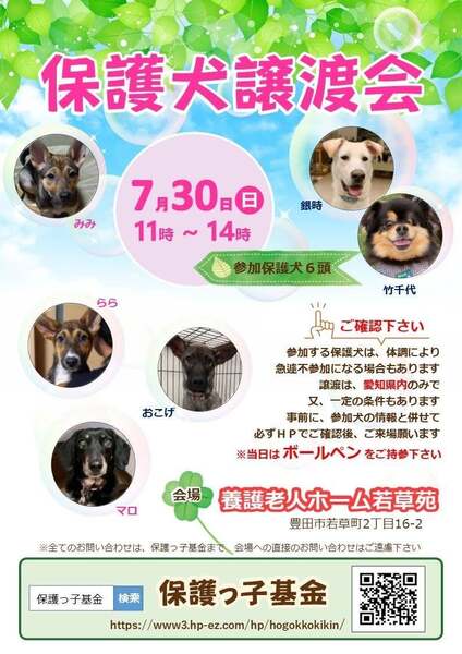 | イベント内容 | 豊田市にて 室内の 保護犬の譲渡会です。 予約は不要です。 ・無料の駐車場多数あり。 ・当日 犬を連れて帰ることはありません。 ★里親希望者はボールペンをお持ち下さい。 ※[ 保護っ子基金 ] で 必ずホームページを検索して 条件などを 確認のうえ、ご来場願います。 http://www3.hp-ez.com/hp/hogokkokikin 現在は6匹の犬が 参加予定でございます。 犬の毎日の様子は 各 預かりのブログなどを ご確認ください。 当日の変更点や 参加犬について 当日の朝 9時30分以降 必ず確認の上、 ご来場ください。 また他にも ご不明な点が ございましたら7月29日までに ご質問ください。 |