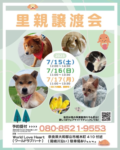 | イベント内容 | ワールドラブハートで里親募集中の動物たちの譲渡会を開催します! 犬猫だけではなく、インコやラット、ウサギにモルモットなどたくさんの保護動物がいます! みんな新しい家族を探しています。写真だけでは伝えきれない魅力が盛りだくさん! 実際に会ってそのかわいさを実感してください♪ ★里親募集中の動物たち★ ・犬、猫 ・ウサギ ・モルモット ・ファンシーラット ・スキニーラット ・インコ ・キンカチョウ ・ウコッケイ ・ヘビ ・カメ ……など 子犬や子猫もたくさんいますよ♡ ぜひお気軽にお越しください! ●混雑をさけるために、事前予約をお願いします。 予約番号080-8521-9553 ショートメールでも可♪ ●当日までに譲渡が決定した・体調がすぐれないなど、やむを得ない理由で不参加の場合があります。ご希望の子がいましたら、当日お問い合わせください。 ●当日、その場での引き渡しはしておりません。譲渡決定後、自宅訪問を兼ねてこちらからお届け致します。 ご来場お待ちしております♪ ★world love heart(ワールドラブハート)は、奈良県大和郡山市で活動している動物保護団体です。 『引き取り依頼は断らない』をモットーに、犬、猫、鶏、小動物、家畜、爬虫類など捨てられた動物を保護しています。 https://worldloveheart-nara.jimdofree.com |