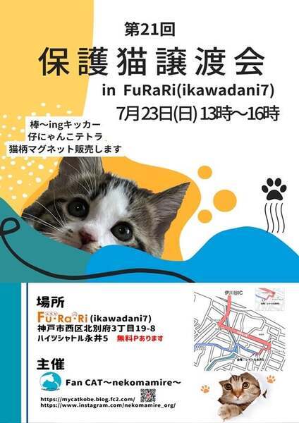 | イベント内容 | 猫の譲渡会 2023年7月23日(日)13時~16時 神戸市西区北別府3丁目19-8 https://goo.gl/maps/Cq15cEHSiWqmYVC8A Fu・Ra・Ri(ikawadani7)無料パーキングあります 子猫がたくさん参加しています! 中猫さん大人猫も参加していますので是非ご参加ください!! 参加の猫ちゃんたちはブログにて掲載しています https://mycatkobe.blog.fc2.com/ お見合いしたいと思われる方は、ブログのメールフォーム、InstagramのDMより お越しになる時間をご連絡ください ※譲渡は無料ではございません(譲渡会参加は無料です) ※譲渡条件がございます ※当日連れて帰れません ※※早い順ではございませんがご縁があれば早くに決まってしまう 場合がありますのでお見合いの予約かお早めにご来場ください 主催 Fan CAT~nekomamire~ |