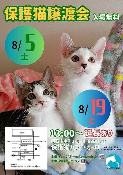 | イベント内容 | 猫の譲渡会 in 明石市 日時 8月19日(土)13時から18時半くらいまで(譲渡会参加は無料です) 場所:明石市本町2-5-14 浜谷ビル2階 保護猫カフェ・カーロ 事務所側 (譲渡会のお問合せはカーロさんにしないようにお願いします) Pは近くにコインパーキングがたくさんありますのでご利用お願いします たくさんの猫たちが参加しています 今回は色んな子猫たちがたくさん参加しています 参加猫さんの紹介をしていますのでブログにてご確認ください 本気で猫を飼いたい方是非ご来場ください 早い順ではございませんが早くに決まってしまう場合がございますので お早めにお越しいただくか面会予約をお願いします ※猫の譲渡は無料ではありません(譲渡会参加は無料です) ※当日連れて帰れません ※譲渡条件があります ●参加猫たちのお紹介やお問い合わせ(面会予約等)は ブログよりご連絡お願いします https://ameblo.jp/wan--love--nyan/ 主催:ハピニャン |