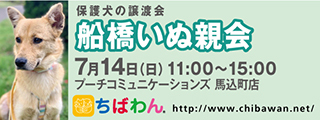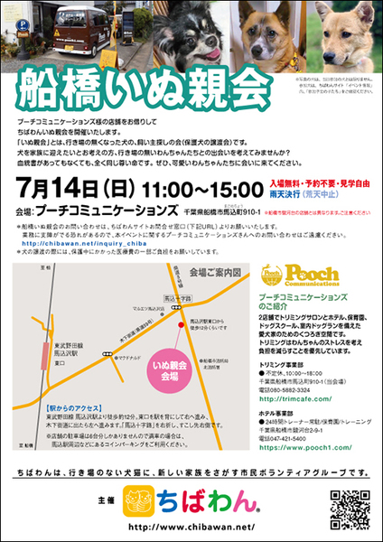 | イベント内容 | 7月船橋いぬ親会のご案内です。 可愛い保護わんこたちが新しい家族との出会いを求めて参加します!! いぬ親会見学は予約等必要ありません。 是非、ご家族同伴でご来場下さい。 開催日:7月14日(日)11:00~15:00 室内開催 雨天決行 場所:プーチコミュニケーションズ 千葉県船橋市馬込町910-1 《アクセス》 ●東関東自動車道 谷津船橋インターからの道順 谷津船橋インターを降りて右折し県道15号にぶつかったら右折しそのまままっすぐ3キロほど直進。 右手に消防署が見えたら次の馬込交差点の5メートル程手前左側が会場です。 ●京葉道路 花輪インターからの道順 京葉道路「花輪インター」を降りて鎌ヶ谷・松戸方面(8号線)を3キロほど直進。 右手に消防署が見えたら次の馬込交差点の5メートル程手前左側が会場です。 ●電車からのアクセス 東武野田線 馬込沢駅 下車 改札を出て右に向かって歩き、一つ目の交差点を左。10分ほど歩いたのちに馬込町交差点を右に渡り5メ-トル。約徒歩15分。 《注意事項》 【当日の流れ】 (1)家族募集中のいぬとお会いになりたい方はどなたでも自由にご参加いただくことができます。ちばわんボランティアは名札をつけておりますので、ご遠慮なくお声をかけて下さい。また、募集中のいぬのそばには預かりボランティアが控えておりますのでいぬの性格や生活習慣など、遠慮なくご質問ください。 (2)ご希望のいぬが決まったら、お申し込みアンケートにご記入の上、ボランティアにお渡し下さい(前日までにメールでアンケートを送信してお申し込みいただくこともできます。) ◆「いぬ」アンケート送信先: http://chibawan.net/contactform_dog (3)アンケート内容を拝見し、お話させていただきます。 (4)原則として一両日中にお返事の連絡をさせていただきます。 (5)ご縁が成立した場合には、後日、こちらからご自宅までいぬをお届けし、約1ヶ月のお試し生活に入っていただきます。お届けの際に、書面での譲渡契約書を交わします。 ※ワクチン・不妊手術代など保護犬にかかった費用は、家族になるいぬ親さんにもご負担をお願いしています 【お知らせ】 ◆Pooch(プーチ)さんのドッグトレーナーさんにご協力いただいて、無料しつけ相談会を開催します。 ご希望の方は、ちばわんボランティアに声をかけて下さい。 ◆会場ではチャリティグッズを販売します 【お問い合わせ】 いぬ親会について:http://chibawan.net/inquiry_chiba ※いぬ親会当日はメールが見られません。また、お問い合わせの際は、必ず「具体的な件名」を入れて多数の迷惑メールと区別がつくようにお願いいたします。 ※本イベントに関するPoochさんへのお問い合わせはご遠慮ください。 ちばわんホームページ http://chibawan.net/ 船橋いぬ親会イベントホームページ http://chibawan.net/event/20190714-fubabashi-dog |
