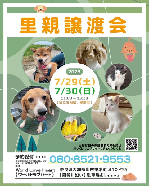 | イベント内容 | ワールドラブハートで里親募集中の動物たちの譲渡会を開催します! 犬猫だけではなく、インコやラット、ウサギにモルモットなどたくさんの保護動物がいます! みんな新しい家族を探しています。写真だけでは伝えきれない魅力が盛りだくさん! 実際に会ってそのかわいさを実感してください♪ ★里親募集中の動物たち★ https://satoya-boshu.net/foster/?@button_name@=search&FosterParent_MemberID=1161 ・犬、猫 ・ウサギ ・モルモット ・ファンシーラット ・スキニーラット ・インコ ・キンカチョウ ・ウコッケイ ・ヘビ ・カメ ……など 子犬や子猫もたくさんいますよ♡ ぜひお気軽にお越しください! ●混雑をさけるために、事前予約をお願いします。 予約番号080-8521-9553 ショートメールでも可♪ ●当日までに譲渡が決定した・体調がすぐれないなど、やむを得ない理由で不参加の場合があります。ご希望の子がいましたら、当日お問い合わせください。 ●当日、その場での引き渡しはしておりません。譲渡決定後、自宅訪問を兼ねてこちらからお届け致します。 ご来場お待ちしております♪ ★world love heart(ワールドラブハート)は、奈良県大和郡山市で活動している動物保護団体です。 『引き取り依頼は断らない』をモットーに、犬、猫、鶏、小動物、家畜、爬虫類など捨てられた動物を保護しています。 https://worldloveheart-nara.jimdofree.com |