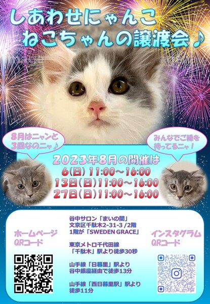 | イベント内容 | 「しあわせにゃんこ」は行き場のない猫ちゃんと里親様との 出逢いの場を提供するグループです♪ 子猫も成猫もハンデのある猫もみんな新しい家族を待っています♪ みなさまのご来場を保護主、スタッフ一同心よりお待ちしております♪ 開催にあたり感染対策として各種制限等を設けております。 ※詳しくはホームページ譲渡会情報をご確認願います。 http://www.shiawasenyanko.net いよいよ夏本番!チビッコ保護も夏本番(泣) 暑くて出歩くのもおっくうな季節ですが ご縁を待っているにゃんこと皆様のご来場をお待ちしております♪ ◆開催日/開催時間◆ 2023年8月6日(日) 11:00~16:00 ご希望の猫ちゃんがいらっしゃる場合は11時30分までに受付をお願い致します。 複数のお申し込みがある場合は11時30分で受付を終了させて頂く場合がございます。 受付をされた全ての里親様とお見合いをさせて頂きます。 ※先着順ではございません。 ※当日、猫ちゃんを連れて帰ることは出来ません。 後日調整のうえ保護主が里親様宅へお届けいたします。 ◆会場◆ 受付はまいの間1階です♪ 直接会場までお越し下さい♪ 譲渡会場:東京都文京区千駄木2-31-3 1階が北欧雑貨ショップ「SWEDENGRACE」 2階が谷中サロン「まいの間」 ※詳しいアクセスはホームページをご覧下さい http://www.shiawasenyanko.net 谷中サロン「まいの間」の情報はこちら http://neko-to-kyo.com/#maima ◆交通手段◆ 東京メトロ千代田線「千駄木」駅より徒30秒 JR山手線「西日暮里」駅より徒歩11分 JR山手線「日暮里」駅より谷中銀座経由で徒歩13分 ※お車でご来場の際、駐車場のご用意はございません。 近隣のコインパーキング等をご利用ください。※近隣に沢山あります。 いつ里の掲載参加猫一覧はこちらから https://satoya-boshu.net/mypage/foster_list.php?@ps@=none アメーバブログの里親募集にゃんこはこちら https://ameblo.jp/shiawasenyan-ko/theme-10092719565.html ◆猫ちゃんとのお見合い◆ 掲載している猫ちゃんは基本的に譲渡会場でのお見合いのみとなります。 譲渡会への参加が決定している猫ちゃんはその譲渡会で里親様が決定しなかった場合のみ保護主宅でのお見合いが可能となります。 自宅お見合いを希望される里親様はメール(info@shiawasenyanko.net)にてご相談ください。 ◆当譲渡会では猫ちゃんと里親様のスキンシップを大切にしています◆ 新しい家族として20年以上いっしょに暮らしていく猫ちゃんです。 譲渡会場でたくさんの猫ちゃんと触れ合って良きパートナーを見つけてください。 はじめて猫ちゃんを迎える不安や先住猫ちゃんとのトライアルの注意点、猫ちゃんと里親様の暮らし方など気軽にご相談ください。 経験豊富な保護主や猫大好きスタッフがアドバイスさせていただきます。 ◆子猫ご希望の里親様◆ 子猫は急な下痢や発熱等により体調が急変し、数時間対応ができなかっただけでも命を落とす事があります。 その為、当譲渡会では月齢によりお留守番のない又は少ないご家庭への譲渡に限らせて頂いております。 また里親様と子猫ちゃんが安心してトライアル期間を過ごせるよう体重が1㎏程になってからのお届けとさせて頂いております。 ◆里親希望のみなさまへ◆ ご家族の皆様で生涯、家族の一員としてたっぷり愛情を注いでくださるご家庭をお待ちしております。 下記に該当する希望者様へ ・独身、単身者の方 ・友人同士、同棲でのお住まいの方 ・高齢者のみのご家庭の方 は、ご相談の上、譲渡を判断させて頂きます ・適正飼育の不可能な方 ・脱走防止対策を考えて頂けない方 ・定期報告の不可能な方 は、ご遠慮下さいますようお願い致します ◆ご負担頂く費用について◆ 譲渡の際に譲渡負担金(医療費の一部、譲渡金、お届け時の交通費)を里親様にご負担頂く事により 過酷な状況にいる猫ちゃんを保護し新しいご家族の元へ送り出す事ができています。 皆様のご理解とご協力にボランティア一同、心より感謝しております。 ご負担頂く医療費につきましてはホームページに詳しく記載させて頂いております。 http://www.shiawasenyanko.net/onegai.html しあわせにゃんこホームページ http://www.shiawasenyanko.net メールでのお問い合わせ info@shiawasenyanko.net |