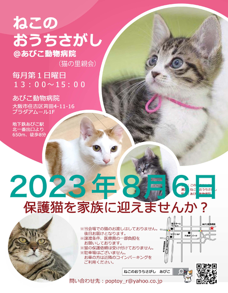 | イベント内容 | 座敷形式のアットホームな里親会なので、保護猫たちとじっくりお見合いできます♪ ご予約不要、開催時間内にお気軽にお越しください^ ^ 参加猫情報は、下記のブログにて順次ご紹介してます(o^^o) https://ameblo.jp/jillrill/theme-10105668887.html 第46回☆ねこのおうちさがし@あびこ動物病院 日時 : 2023年8月6日(日) 時間 : 13時00分〜15時00分 場所 : あびこ動物病院 大阪市住吉区苅田4-11-16 地下鉄御堂筋線あびこ駅北一番出口より650m、徒歩8分 ☆駐車場はございませんので、近隣のコインパーキングをご利用ください。 近隣のご迷惑にならないよう、路上駐車はされませんようお願いします。 ☆会場へのお問い合わせは固くお断りします。 (場所をご提供くださるだけなので、参加猫のについてはご存知ありません) ★譲渡には完全室内飼育、同意書への署名・捺印などの 条件、医療費の一部負担があります。 ★猫ちゃんは、後日お届けとなります。 当日連れて帰ることはできません。 ★参加予定の猫ちゃんは、里親会の前に里親さまが決定する場合や、体調により不参加となる場合があります。 主催:この子のあした 運営:ねこのおうちさがし 協力:あびこ動物病院 問い合わせ先 : poptoy_r☆☆☆yahoo.co.jp (☆☆☆を@に変更してください) ※スジュールにより来場できないけど気になる子がいらっしゃる場合、お問い合わせ頂きましたら、アンケートにお答え頂いたのち保護主さんにお繋ぎいたします。 |