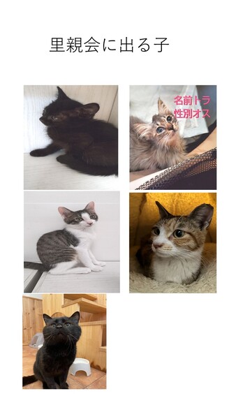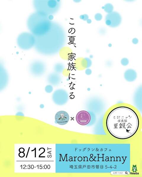 | イベント内容 | 子猫3頭 成猫2頭 合計5頭の里親会を開催します。 【日程】8/12(土)PM12:30~15:00まで 【場所】埼玉県戸田市笹目5-4-2 ドックカフェ Maron & Hanny お店の前に車4台の駐車スペースあり 少し歩きますがコインパーキングもあります。 お店前に案内係がいます。 カフェの中リンク↓ https://todapi.info/cafe/maronhanny/ 広々とした店内なのでゆっくりとご覧頂ると思います。 お店貸し切りです。予約制ではありません。 里親会に出る子はブログでご案内しますので是非ご覧になって下さい。 ブログ https://ameblo.jp/sakutotaro203/ 是非、足を運んでみて下さい。 *ご支援のお願い ●フードなんでもOK。開封済OK。賞味期限内でお願いします。 ●トイレシート(レギュラー薄型)とトイレチップをお願いします。 以上、よろしくお願いいたします。 主催 とだニャン 協力 ドックカフェ Maron & Hanny |