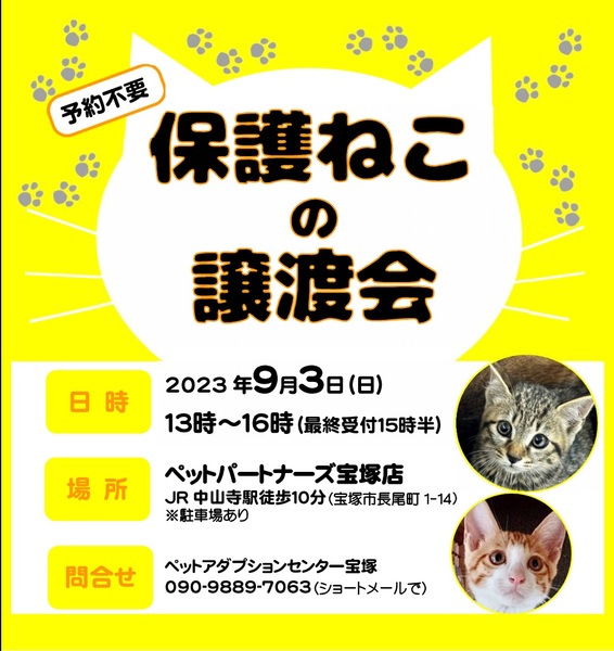 | イベント内容 | 保護ねこ♥譲渡会in 宝塚 https://ameblo.jp/takarazuka-tnr/ 生体販売をやめるという英断をした老舗ペットショップさんで 猫の譲渡会を開催します! 行き場のない猫達に素敵な家族を見つける為、 勇気ある決断をしたペットショップさんと一緒に頑張ります! 【日時】 2023年6月18日(日) 13時~16時(受付は15時半まで) 【場所】 ペットパートナーズ宝塚店 JR福知山線『中山寺』駅より徒歩約10分 兵庫県宝塚市長尾町1-14 ※駐車場あります。 【予約不要】 直接会場へお越し下さい。 ★ご年配の方には、「一時預かり制度」 「終生預かり制度」など、できるかぎり 飼育して頂けるようご相談にのります。 【ご注意事項】 ※ 譲渡は先着順ではありません! すべての方の見学が終わってから猫達にいちばん合う里親様を決定いたします。 ※当日、猫を連れて帰る事はできません。里親様になって頂くことが決まりましたら、 後日ご自宅までお連れします。 ※里親のご希望をお断りする事もありますのでご了承お願いいたします。 【主催】 特定非営利活動法人 TNR宝塚/ペットアダプションセンター宝塚 【協力】 ペットパートナーズ宝塚店 【後援】 宝塚市 【問合せ】 kaizaru7★yahoo.co.jp(★を@に変えて下さい) |