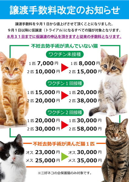 | イベント内容 | 子猫30匹!!子猫だけ30匹!ぜ~んぶ子猫!30匹です♪ エアコン完備の屋内会場で、好きなだけ猫を抱っこできます 癒されに来てください。 http://miyoshineko.sblo.jp/article/190498444.html ―譲渡手数料改定― 9月1日から譲渡手数料が大幅値上げとなります。 8月31日までに仮譲渡の申込を頂きますと従来の手数料となります。 【子猫だけいます。萌えすぎ注意!】 8月20日(日)/10時~15時 三好ヶ丘カリヨンハウスイベント広場(みよし市三好丘2-2-1) 無料駐車場48台、近隣に大型コインPあり 【ご来場前にお読みください】 子猫の譲渡会は大変混み合います。 混雑時は入場制限を行い、しばらくお待ち頂く場合があります。 すべての方が入場、見学できるように調整いたします。 適正と条件を十分考慮させて頂き、トライアル先は抽選で決まります。 先着や申入れの順番ではございません。 当選されたご家庭のみに電話連絡を差し上げます。 抽選に外れた方に連絡を差し上げる事ができません。予めご了承ください。 体調不良等で不参加になる猫もございます。 (=^・^=)(=^・^=)(=^・^=)(=^・^=)(=^・^=)(=^・^=) ■保護猫一覧 https://miyoshi-neko.jp/foster_parents.html ■インスタ本館 https://www.instagram.com/miyoshineko ■インスタ別館 ←保護猫動画あります。 https://www.instagram.com/miyoshi_neko77 ■NPO法人三好ネコの会 https://miyoshi-neko.jp |