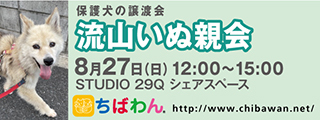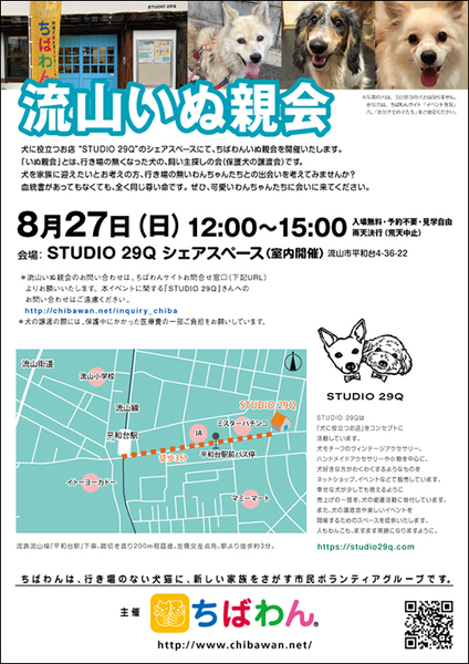 | イベント内容 | “STUDIO 29Q”にて第19回 流山いぬ親会を開催いたします。 飼い主探しをしている保護犬達に会いにきてみませんか。 ※いぬ親会見学は予約等必要ありません。無料でどなたでも入場できます。ただし、混雑を避けるために入場制限をさせていただく場合があります。 ※ネットによる募集も平行して行っているため、参加予定の犬が当日までに決定・不参加となる場合もあります。 ※イベントバナーに写真が掲載されている犬が参加するとは限りません。参加犬は本サイトに順次掲載されますのでそちらをご確認ください。 開催日:8月27日(日)12:00~15:00 室内開催:雨天決行 (荒天中止) 場所:STUDIO 29Q シェアスペース(2階) 千葉県流山市平和台4-36-22 【会場アクセス】 流鉄流山線「平和台駅」下車。踏切を渡り200m程直進、左側交差点角。駅より徒歩約3分。 駐車場はございません。当日お車の方は近隣のコインパーキングをご利用ください。 【注意事項】 《ご来場される皆様へのお願い》 臆病な性格の犬や、子供さんを苦手とする犬も参加しています。いきなり触ったりせず、まずボランティアに声をかけてください。 お子様と一緒にご来場される際には、手を繋ぐなどして頂き、お子様だけで参加犬に近づくことのないようご注意ください。 ※会場に同伴される犬には、必ずリード(引き綱)をつけてください。 【お知らせ】 ◆会場ではチャリティグッズを販売します 【お問い合わせ】 いぬ親会について:https://chibawan.net/inquiry_chiba ※いぬ親会当日はメールが見れません。また、お問い合わせの際は、必ず「具体的な件名」を入れて多数の迷惑メールと区別がつくようにお願いいたします。 流山いぬ親会イベントホームページ https://chibawan.net/event/20230827-nagareyama-dog ちばわんホームページ https://chibawan.net/ |