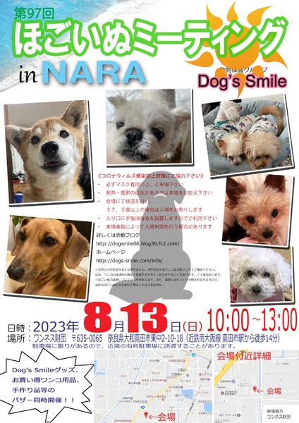 | イベント内容 | 8月13日(日曜日)10時~13時、奈良県大和高田市のワンネス財団エモーショナルリテラシーセンターにて「第97回ほごいぬミーティングat奈良大和高田」を開催します。 保護犬を家族に迎えようと考えている方、保護犬に会ってみたい方、保護犬について知りたい方、ぜひご来場ください。 相性を見るためなど先住わんこさん、卒業わんこさんのご参加ももちろんOKです。 当日は、Dog's smileグッズやワンコ用品の販売、Dog's smileを応援してくださる方々が手作りされた手作り雑貨などの販売も行います。どれもお買い得です。 また、売り上げは、私たちの活動資金になります。ぜひご協力をお願いします。 来場者のみなさまには、コロナウイルス感染拡大防止に御協力をお願いします。 ・発熱・風邪の症状のある方の入場は御遠慮願います。 ・入場時は、手指消毒への御協力をお願いします。 ・来場者の状況により、入場制限を行う場合があります。 なお、来場予定のワンコについては、活動ブログでご確認ください。 日時 令和5年8月13日(日)午前10時~午後1時 場所 ワンネス財団エモーショナルリテラシーセンター 奈良県大和高田市東中2-10-18 (近鉄南大阪駅高田市駅から南に徒歩14分) 協力 ワンネス財団、株式会社松田電気工業 |