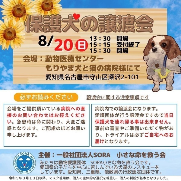 | イベント内容 | 保護犬の譲渡会を開催致します。 【注意】会場をご提供頂いている病院への直接のお問い合わせはお控えください。 急患時は命に関わり、大変ご迷惑となります。 ご配慮のほどお願い申し上げます。 もりやま犬と猫の病院さま 2階会議室 〒463-0811 名古屋市守山区深沢2-101 《ご注意》 家族希望ワンコがいる場合のお見合いに限定させていただきます。 事前のお申込みは不要です。保護活動ブログで、開催日の数日前に譲渡会参加が決定したワンコたちのご案内もしておりますので、ご希望のワンコの参加をご確認してお越し頂けますと幸いです。 なお、新型コロナウィルス感染拡大の状況におきまして、中止させていただくこともございますのでご了承下さい。 SORA公式ホームページ https://sora-chiisana.org/foster/ SORA公式活動メインブログ https://ameblo.jp/sora-chiisana-inochi/ SORAイベントブログ https://ameblo.jp/sora-charity-events/ |