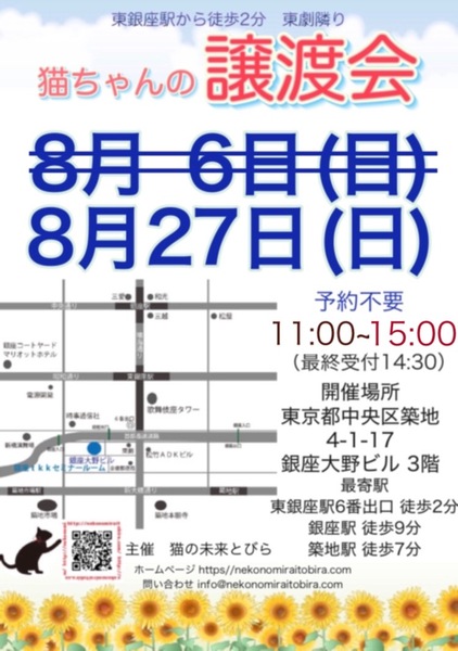 | イベント内容 | 東銀座で保護猫の譲渡会を開催しています「猫の未来とびら」です♪ 恵まれない環境にいる猫たちが未来へのとびらを開いて幸せなご縁に繋がる橋渡しをしていきます。 たくさんの猫ちゃんと保護主・スタッフ一同みなさまのご来場を心よりお待ちしています! 子猫ちゃん〜成猫ちゃんまで参加します♪ ※コロナ対策のマスク着用が緩和されました。 マスクを着用するかどうかは個人の判断となりましたが、 感染防止対策の上では、マスクは有効な手段です。 当会としましては、従来通りマスク着用をお願いしたいと思います※ 【ご来場いただく皆様には下記についてお願い致します】 ★不織布マスクの着用をお願い致します。 ★譲渡会場にお入り頂く前に手洗いと手の消毒をお願い致します。 ★熱のある方や体調の優れない方は譲渡会への来場を見合わせて頂けますよう、お願い致します。 ★来場者数によりましては人数制限もありますので長時間お待たせてする場合もございます。 予めご了承下さい。 コロナウイルス感染防止の為、大変恐縮ですが何卒ご理解とご協力、ご了承をいただけますようお願い致します。 ★☆★★☆★★☆★★☆★★☆★★☆★★☆★★☆★★☆★ ★開催日時 2023年8月27日(日) 11:00~15:00(最終受付 14:30) ★会場 東京都中央区築地4-1-17 銀座大野ビル 3階 (東劇となり) ★最寄駅 東銀座駅 6番出口 徒歩2分 銀座駅 徒歩9分 ・築地駅 徒歩7分 駐車場は当ビル又は近隣のコインパーキング等をご利用ください。 会場への直接のお問い合わせはご遠慮くださいませ。 ★☆★★☆★★☆★★☆★★☆★★☆★★☆★★☆★★☆★ 会場で猫ちゃんと触れ合ってご縁を繋いでください。 里親様・猫ちゃんが双方、幸せな家族になれるよう保護主・スタッフがサポート致します。 ご不安な事はお気軽にご相談ください。 入場無料です。事前のご予約は不要です。 当日猫ちゃんの引き渡しはございません。 後日、保護主が里親様宅へお届けいたします。 ※参加予定猫ちゃんは、急な体調不良等で不参加になる場合もございます。 開催当日の朝、当会ブログにて不参加の最新情報を掲載致しますのでご確認をお願い申し上げます。 ◇譲渡に関してのお願い・基本条件 1.家族の一員として終生最期まで愛育下さい。 2.完全室内飼い・ペット可のお住まい(契約書を拝見致します) 3.脱走防止対策 4.避妊・去勢手術 5.里親様のご自宅へのお届け 6.譲渡誓約書への署名捺印・身分証明書の提示 7.医療費譲渡金のご負担 8.定期報告 9.トライアル期間有り ※保護主により譲渡条件は異なりますので会場で直接ご相談ください。 60才以上の方のみのご家庭、未成年の方、単身の方、同棲中の方、 小学生低学年以下のお子様のいる方、必要な脱走対策を施していただけない方は譲渡をご遠慮頂く場合もございますのでご了承ください。 仔猫の場合は主にお世話される方のご年齢は55歳までとさせて頂きます。 オーバーする方はご相談くださいませ。 小さな子猫の譲渡は体重が1kgになってからのお届けやお留守番の無い(少ない)ご家庭を希望いたします。 医療費譲渡金に関しましては詳しくはホームページの 【譲渡に関してのお願い】【譲渡の流れ】をご覧くださいませ。 ~主催 猫の未来とびら~ |