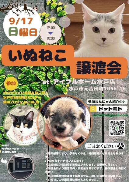 | イベント内容 | ★ 毎月 【 第3 日曜 】 定期開催中★ アイフルホーム水戸店さんのモデルルームにて、いぬねこ譲渡会を開催! ご家族皆さんでお見合いに来てみませんか。 ボランティアや保護犬猫にご興味のある方、 ペットと暮らす住宅にご興味のある方、 ご来訪大歓迎です。 水戸市愛護センターの収容いぬねこたちも参加しています。 応援よろしくお願いします。 ※使わないフードやおやつ(未開封)、ブランケット、ホッカイロなど、犬猫用品やその他をご寄付頂けるととても助かります。飼い主のいない犬猫や、センター収容動物にて使用させていただきます。 ※保護依頼は承れませんが、アドバイスはやご提案は出来る限りでしています。 ●入場無料 ●予約不要(混雑時は時間制限を設けての入場となります) ●駐車場有(混雑時は近隣パーキングのご利用をお願いすることがあります) ●アイフルホーム水戸店さんの平屋モデルルームにて開催 ★犬猫にも人にも思いやりのある行動をお願いしています。 【参加わんにゃん紹介中】 ★ドットミト ブログ https://ameblo.jp/hibisasumama/ ★ドットミトインスタグラム https://www.instagram.com/shikochan45 ※屋外もクーラーを設置していますが、それでも暑さが厳しいときは、犬はお休みか時間短縮します。 (犬の負担軽減の為ですので、ご容赦ください。室内で参加にするかもしれません) |