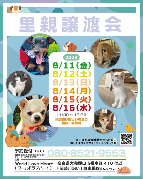 | イベント内容 | ワールドラブハートで里親募集中の動物たちの譲渡会を開催します! 犬猫だけではなく、インコやラット、ウサギにモルモットなどたくさんの保護動物がいます! みんな新しい家族を探しています。写真だけでは伝えきれない魅力が盛りだくさん! 実際に会ってそのかわいさを実感してください♪ ★里親募集中の動物たち★ https://satoya-boshu.net/foster/?@button_name@=search&FosterParent_MemberID=1161 ・犬、猫 ・ウサギ ・モルモット ・ファンシーラット ・スキニーラット ・インコ ・キンカチョウ ・ウコッケイ ・ヘビ ・カメ ……など 子犬や子猫もたくさんいますよ♡ ぜひお気軽にお越しください! ●混雑をさけるために、事前予約をお願いします。 予約番号080-8521-9553 ショートメールでも可♪ ●当日までに譲渡が決定した・体調がすぐれないなど、やむを得ない理由で不参加の場合があります。ご希望の子がいましたら、当日お問い合わせください。 ●当日、その場での引き渡しはしておりません。譲渡決定後、自宅訪問を兼ねてこちらからお届け致します。 ご来場お待ちしております♪ ★world love heart(ワールドラブハート)は、奈良県大和郡山市で活動している動物保護団体です。 『引き取り依頼は断らない』をモットーに、犬、猫、鶏、小動物、家畜、爬虫類など捨てられた動物を保護しています。 https://worldloveheart-nara.jimdofree.com |