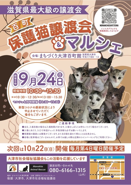 | イベント内容 | 滋賀県最大級の保護猫譲渡会。 毎回40頭以上の猫さんが参加します。 初めての方でも安心して譲渡の安心サポートの譲渡会です。 予約不要、入場無料。 参加猫さんのご紹介は https://ameblo.jp/hyakucyojyoutokai または、Instagram @hyakucyoujyotokai をご覧下さい。 ※ 後援 大津市、大津市社会福祉協議会 |