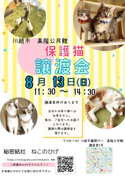 | イベント内容 | 【秘密結社ねこのひげ♡保護猫譲渡会】 8/13(日) 11:30~14:30 川越市藤間27-1 高階公民館 講座室2号内 にて開催します☆ 2023年入居!第二弾三弾の仔猫たちから♪ 3~4ヶ月齢のちびっ子ギャングが 総勢20頭over♡ 3才までは子猫だにゃー!なヤング猫や まだまだ若いもんにゃ負けない!な オトナ猫たちも数頭 ワクテカで参加します♪ 未来のご家族さまと 愛し愛されな 両想いになれますように♡ 家族にするなら保護猫だべ♪♪ こんなご時世だけど 新しい家族と笑顔で暮らしたい♪ という方は是非会いにいらしてください♡ 新型コロナ対策として 受付名簿のご記入、消毒 マスク着用などのご協力をお願い致します。 ご不明な点がございましたら インスタグラム @秘密結社ねこのひげ の DMまでお問い合わせ下さい。 |