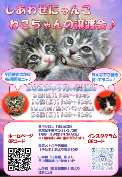 | イベント内容 | 「しあわせにゃんこ」は行き場のない猫ちゃんと里親様との 出逢いの場を提供するグループです♪ 子猫も成猫もハンデのある猫もみんな新しい家族を待っています♪ みなさまのご来場を保護主、スタッフ一同心よりお待ちしております♪ 開催にあたり感染対策として各種制限等を設けております。 ※詳しくはホームページ譲渡会情報をご確認願います。 http://www.shiawasenyanko.net 残暑厳しい9月もまだまだチビッコてんこ盛り( ゚Д゚) 食欲の秋ならぬにゃんこの秋にしませんか? ご縁を待っているにゃんこと皆様のご来場をお待ちしております♪ ◆開催日/開催時間◆ 2023年9月10日(日) 11:00~16:00 ご希望の猫ちゃんがいらっしゃる場合は11時30分までに受付をお願い致します。 複数のお申し込みがある場合は11時30分で受付を終了させて頂く場合がございます。 受付をされた全ての里親様とお見合いをさせて頂きます。 ※先着順ではございません。 ※当日、猫ちゃんを連れて帰ることは出来ません。 後日調整のうえ保護主が里親様宅へお届けいたします。 ◆会場◆ 受付はまいの間1階です♪ 直接会場までお越し下さい♪ 譲渡会場:東京都文京区千駄木2-31-3 1階が北欧雑貨ショップ「SWEDENGRACE」 2階が谷中サロン「まいの間」 ※詳しいアクセスはホームページをご覧下さい http://www.shiawasenyanko.net 谷中サロン「まいの間」の情報はこちら http://neko-to-kyo.com/#maima ◆交通手段◆ 東京メトロ千代田線「千駄木」駅より徒30秒 JR山手線「西日暮里」駅より徒歩11分 JR山手線「日暮里」駅より谷中銀座経由で徒歩13分 ※お車でご来場の際、駐車場のご用意はございません。 近隣のコインパーキング等をご利用ください。※近隣に沢山あります。 いつ里の掲載参加猫一覧はこちらから https://satoya-boshu.net/mypage/foster_list.php?@ps@=none アメーバブログの里親募集にゃんこはこちら https://ameblo.jp/shiawasenyan-ko/theme-10092719565.html ◆猫ちゃんとのお見合い◆ 掲載している猫ちゃんは基本的に譲渡会場でのお見合いのみとなります。 譲渡会への参加が決定している猫ちゃんはその譲渡会で里親様が決定しなかった場合のみ保護主宅でのお見合いが可能となります。 自宅お見合いを希望される里親様はメール(info@shiawasenyanko.net)にてご相談ください。 ◆当譲渡会では猫ちゃんと里親様のスキンシップを大切にしています◆ 新しい家族として20年以上いっしょに暮らしていく猫ちゃんです。 譲渡会場でたくさんの猫ちゃんと触れ合って良きパートナーを見つけてください。 はじめて猫ちゃんを迎える不安や先住猫ちゃんとのトライアルの注意点、猫ちゃんと里親様の暮らし方など気軽にご相談ください。 経験豊富な保護主や猫大好きスタッフがアドバイスさせていただきます。 ◆子猫ご希望の里親様◆ 子猫は急な下痢や発熱等により体調が急変し、数時間対応ができなかっただけでも命を落とす事があります。 その為、当譲渡会では月齢によりお留守番のない又は少ないご家庭への譲渡に限らせて頂いております。 また里親様と子猫ちゃんが安心してトライアル期間を過ごせるよう体重が1㎏程になってからのお届けとさせて頂いております。 ◆里親希望のみなさまへ◆ ご家族の皆様で生涯、家族の一員としてたっぷり愛情を注いでくださるご家庭をお待ちしております。 下記に該当する希望者様へ ・独身、単身者の方 ・友人同士、同棲でのお住まいの方 ・高齢者のみのご家庭の方 は、ご相談の上、譲渡を判断させて頂きます ・適正飼育の不可能な方 ・脱走防止対策を考えて頂けない方 ・定期報告の不可能な方 は、ご遠慮下さいますようお願い致します ◆ご負担頂く費用について◆ 譲渡の際に譲渡負担金(医療費の一部、譲渡金、お届け時の交通費)を里親様にご負担頂く事により 過酷な状況にいる猫ちゃんを保護し新しいご家族の元へ送り出す事ができています。 皆様のご理解とご協力にボランティア一同、心より感謝しております。 ご負担頂く医療費につきましてはホームページに詳しく記載させて頂いております。 http://www.shiawasenyanko.net/onegai.html しあわせにゃんこホームページ http://www.shiawasenyanko.net メールでのお問い合わせ info@shiawasenyanko.net |
