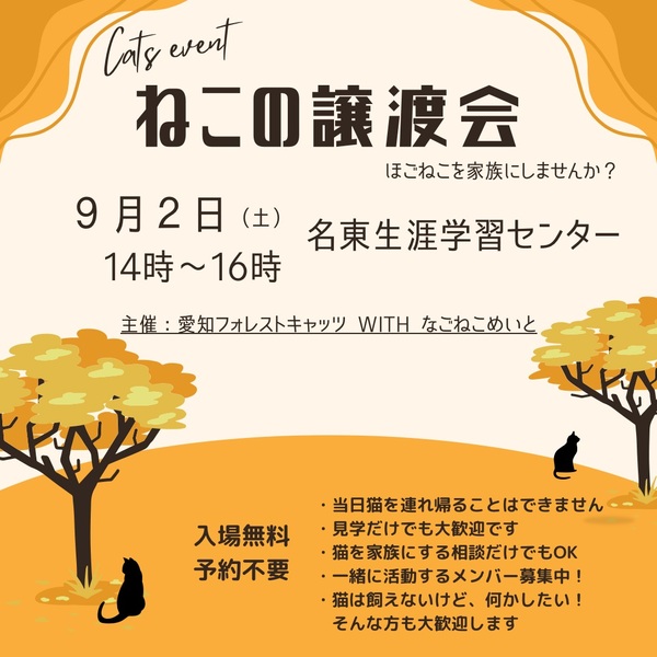 | イベント内容 | 【保護猫の譲渡会】 里親になりませんか? 日時 9月2日(土) 14時〜16時 場所 名東生涯学習センター 名古屋市名東区社が丘3-802 主催 愛知フォレストキャッツ なごねこめいと 地域猫活動やTNR活動の過程などで 保護した猫たち 子猫もいれば、大人猫もいます この時期は3ヶ月〜5ヶ月程度の 子猫が多く参加します 見学、相談だけでも大丈夫! 予約不要、参加費無料なのでお気軽に 猫に関する活動を何かしたい、という方も歓迎です 遊びに来る感覚で、お越しくださいませ ☆猫に関して☆ ・当日は猫を連れ帰ることはできません ・猫を迎えるにあたり、飼育環境などについて お話しをさせていただきトライアル(お試し飼育) から始めさせていただきます ・2週間前後のトライアル期間を経て、問題ない ようであれば、譲渡契約書を結び正式譲渡と なります ・所定の譲渡費用をいただきます |
