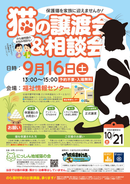 | イベント内容 | 9月16日(土)に「猫の譲渡会&相談会」を開催いたします。 猫少なめのミニ譲渡会&相談会です。 保護猫を迎えたい方はもちろん、猫に関する相談会も同時開催しておりますので、ご近所との猫トラブルなどでお悩みの方もお気軽にお立ち寄りください! 地域猫活動やペット防災についての展示もございます(^^)/ 【日時】2023年9月16日(土)13:00〜15:00 【会場】福祉情報センター(中央福祉センターとなり) 【主催】にっしん地域猫の会 【ホームページ】https://nissinchiikineko.main.jp ※重症化リスクの高い方々が多く利用される福祉センターの施設をお借りしているため、引き続き感染症拡大防止にご理解・ご協力をお願いいたします(受付名簿のご記入、室内の人数制限など)。 ※会場前に駐車場がございますが、数が少ないため、満車時は中央福祉センターの駐車場をご利用ください。図書館のむかいにある市役所の臨時駐車場もご利用いただけます。 ※室内換気のため冷房・暖房が効きにくい場合がございます。 ※ペット同伴のご入場はできませんので、予めご了承ください。 ※譲渡会に関しまして、福祉センターへのお問い合わせはご遠慮ください。 ※猫ちゃんの譲渡には条件がございます。詳細はホームページをご参照ください。 |