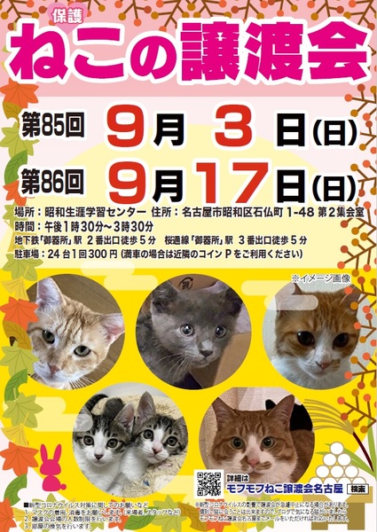 | イベント内容 | モフモフねこ譲渡会名古屋 猫たちの幸せなお家探しのために譲渡会を開催しております。 個人ボランティアの集まりです。 自分たちの出来ることから頑張っております! 一匹でも幸せになれる猫が増えますように 場所 昭和生涯学習センター 第2集会室 住所 名古屋市昭和区石仏町1-48 時間 13時30分~15時30分 交通機関等 地下鉄鶴舞線及び桜通線「御器所」下車2番出口南約300m 3番出口南東約300m 駐車場24台(満車の場合は近隣コインPをご利用ください) 参加猫の情報は下記モフモフねこ譲渡会名古屋ブログにてご確認ください。 https://mofumofuneko4.fc2.net/ 【譲渡会について】 ・譲渡会は入場無料、予約不要です。お気軽にご参加ください。 ・会場へのお問い合わせはご遠慮ください。 ご質問は下記メールアドレスへお願いいたします。 mofumofuneko4☆gmail.com ☆を@に変更してお問い合わせください。 ・猫の引き取りはしておりません。 ・譲渡会当日に猫をお渡しすることはありません。 ・保護主によって譲渡条件が違う場合があります。 ・参加予定でも譲渡会前にトライアルになる場合があります。 ご希望の猫がいましたらまずはお問い合わせをお願いいたします。 【参加猫について】 ・ノミ駆除、駆虫、トイレ躾、ワクチン3種接種済。 ・年齢や健康状態に応じて、避妊手術を行っております。 ・参加予定で紹介していても当日体調不良等で欠席になる場合があります。 【譲渡の約束事】 ・ペット飼育可の住宅にお住まいの方。 ・完全室内飼育。 ・脱走防止の対策をしていただける方。 ・避妊手術未実施の場合、避妊手術 の実施と報告をしていただける方。 ・ご家族全員が猫を飼うことに同意していること。 ・譲渡後、しばらく定期連絡を入れていただける方。 *お一人暮らしの方、60歳以上の方は、身内の方の保証が必要となる場合がございます。 #名古屋昭和区 #昭和生涯学習センター #譲渡会 #保護猫 #地域猫 #さくらねこ #tnr #里親募集 #里親募集中 #猫 #ねこ #殺処分ゼロ #買わずに飼おう #モフモフねこ譲渡会名古屋 #ペットショップに行く前に #譲渡会のお知らせ #猫と暮らしたい |