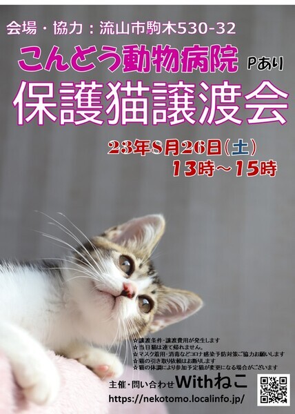 | イベント内容 | 流山市・柏市で活動している 個人ボランティアが保護して大切に育てている 猫たちが多数参加します こんどう動物病院 HP http://www.kondo-ah.server-shared.com/ 駐車場有 参加予定猫については Instagram @withneko2222 および ブログhttps://ameblo.jp/nekotomo2222/ にて掲載しています。 ☆入場無料(ただしお気持ちだけご寄付お願いします) 入場の際 アンケートをご記入いただきます。ご記入していただかない方は入場できません ☆当日猫を連れ帰ることはできません ☆譲渡条件あります。譲渡費用発生します。 ☆新型コロナウィルスの関係で急遽中止になる場合がございます。 その場合はHPまたはSNSに掲載しますので必ずご確認の上 お出かけください ※新型コロナウィルス感染防止のため厳守していただきたい事項がございます マスク着用必須 手指の消毒 入場時アンケート記入(入場制限を行う場合がございます) ※熱のある方の入場はお断りしています ☆当日猫を連れ帰ることはできません ☆譲渡条件あります。譲渡費用発生します。 ☆猫の引き取りはお断りいたします。 ☆ Withねこ https://nekotomo.localinfo.jp |