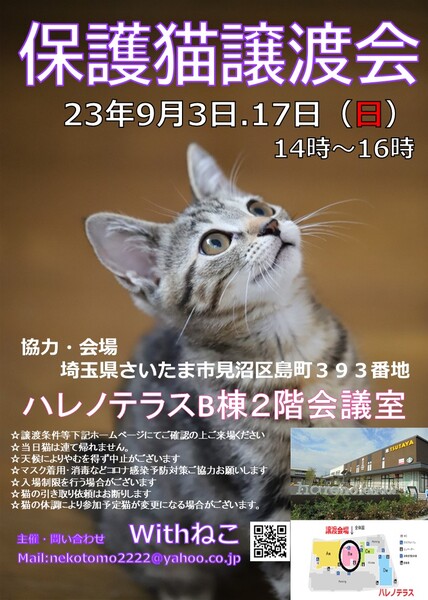 | イベント内容 | ♡♥♡子猫祭り♡♥♡ さいたま市見沼区のショッピングモール ハレノテラスにて 定期譲渡会を開催しています。 ※おうちで食べなかったキャットフード・使わなかった猫砂など ございましたらお持ちください。 ご支援をお願いします。 ◎参加予定猫ちゃんはWithねこInstagram・ホームページにて掲載します。 Instagram https://www.instagram.com/withneko2222/ HP https://nekotomo.localinfo.jp/ ♡♡♡♡♡ハレノテラス保護猫譲渡会♡♡♡♡♡ 【会場】 ハレノテラスB棟2階会議室(マツモトキヨシ横の階段またはエレベーターで2階へ)※幟あります 埼玉県さいたま市見沼区島町393番地 オフィシャルホームページ:http://hare-terra.com/ 駐車場:320台 【アクセス】 JR宇都宮線東大宮駅から徒歩1km (約13分) 東大宮バイパスから車で約3分 予約不要・入場無料 ※混みあった時は入場制限を行いますので 予めご了承ください *ペットを連れての譲渡会入場はお断りしています。 *猫の引き取り、保護依頼は受け付けておりません。(TNRのご相談は譲渡会開催時以外でお願いします) *保護猫の体調、悪天候や不測の事態により、予告なく開催が中止・時間短縮になる場合がございます。 *保護猫の当日引渡しは行っておりません。後日ご自宅へのお届けとなります。 *保護猫の譲渡は先着順ではございません。また、譲渡条件および譲渡費用がございます。 *譲渡会参加時には、手指消毒、他のお客様とのソーシャルディスタンス確保にご協力願います。 *マスク着用は任意とさせていただきますが、咳エチケットに注意し、会話時の唾の飛散にご注意ください。 |