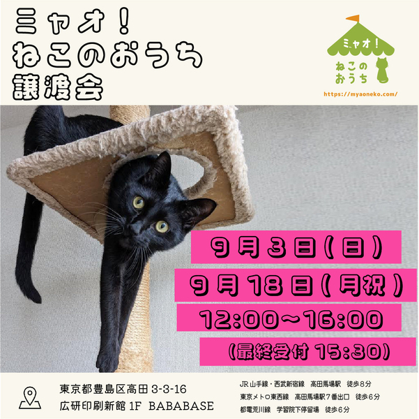 | イベント内容 | 参加する保護猫ちゃんについては、譲渡会一週間程前からホームページにてご確認いただけます。 https://myaoneko.com/cats/ 事前予約はできません。 猫ちゃんをお世話することになるご家族皆様でお越しくださると嬉しいです。 譲渡会場でお会いしましょう♪ 【新型コロナウイルス対策について】 会場受付にて、以下の点をお願いする予定です。 ✿手指消毒 ✿連絡先のご記入 御来場者多数の場合には入場制限を設けさせていただきます。 ※当日沢山のご来場者様がいらっしゃった場合、整理券をお渡しする事がございます。 会場内外で長時間お待たせする場合もございますが、ご理解くださいますようお願い致します。 結果のご連絡は、当日夜〜翌日夜までの間に、お電話もしくはメールにて保護主より直接ご連絡いたします。 ◇譲渡に関してのお願い 【ミャオ!ねこのおうち】では譲渡に際して、以下の要件をお願いしております。 ・完全室内飼いで終生愛育 ・脱走させないための対策 ・不妊去勢手術 ・譲渡誓約書の取り交わし ・医療費の一部ご負担 ※60才以上の方のみのご家庭、独身や、経済的に困難な世帯、 必要な脱走対策を施していただけない方には原則的に譲渡はご遠慮頂いております。 また、保護主により譲渡条件が異なる場合もございますので会場でご相談ください。 参加予定ねこちゃんは、急な体調不良などで不参加になる場合もございます。 【譲渡に関してのお願い】・【医療費の一部のご負担】・【譲渡までの流れ】など 詳しくは下記ホームページをご覧くださいますよう宜しくお願い致します。 ミャオ!ねこのおうち ホームページ https://myaoneko.com |