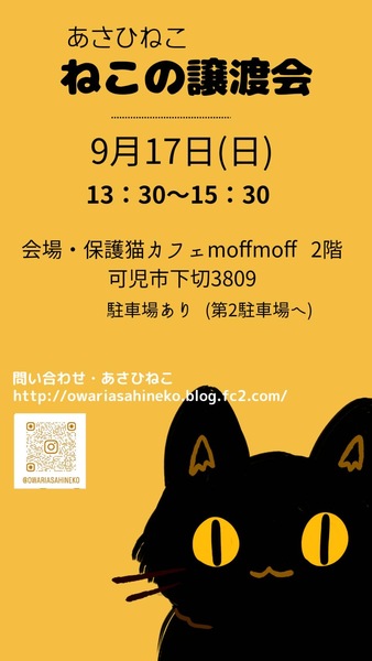 | イベント内容 | \譲渡会を開催します!/ 優しい家族を待っている猫たちが 沢山参加します! ♡猫を迎えたい ♡運命の猫ちゃんと出会いたい ♡猫ちゃんと家族になりたい そんな方のご来場を お待ちしております! 【譲渡会情報】 2023年9月17日(日) 13:30〜15:30 会場 ☕️保護猫カフェmoffmoff 2階 岐阜県可児市下切3809 ?駐車場あり(第2駐車場) カフェご利用の方は靴下着用でお願いします 会場はお店の2階です お店へのお問い合わせはご遠慮ください ┈┈┈┈┈┈┈┈┈┈ ◎全頭ワクチン接種、ウイルス(FIV、FeLV)検査、マイクロチップ装着済み ◎譲渡には条件がございます 詳しくは下記ブログをご覧ください ↓↓↓ 主催者【あさひねこ】ブログ http://owariasahineko.blog.fc2.com/ |