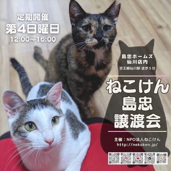 | イベント内容 | ペットとしてではなく、生涯家族として猫を迎えて下さる方への譲渡となります。 原則『譲渡会』にて正式なお申込みを承っております。 譲渡会には家族を待っている猫さん達がたくさん参加します♪ ▽▲ねこけん定期譲渡会▲▽ ★毎月第4日曜日は島忠ホームズ仙川店にて開催★ [時間] 12:00〜16:00 [会場] 島忠ホームズ仙川店 〒182-0003 東京都調布市若葉町2-1-7 https://www.shimachu.co.jp/gmshop/tokyo/313.html [交通] ・京王線「仙川駅」より徒歩約5分 ※事前のご予約は必要ございません。ご家族皆様でお越し下さい。 ※混雑時は整理券をお配りし、お待ちいただく場合がございます。 ※屋内での開催となり雨天決行です。 ※猫ちゃんたちとのふれあいはできません。 --- 開催・参加イベント一覧 https://satoya-boshu.net/event/?@button_name@=search&Event_MemberID=1288 --- ◆必ずお守り頂く事◆ ①終生飼養 ②完全室内飼養 ③年1回のご報告 ④ペット飼育可能な物件にお住まいであること ただし、以下の該当の方は、譲渡出来ない場合がございます。 ※学生、安定的な収入のない方 ※60歳以上の方は、成猫さんを家族に迎え入れることが出来ます。 里親様のご年齢に応じた成猫の譲渡となりますのでご相談ください。 ◆譲渡費用について◆ 不妊去勢手術・医療費の一部負担をお願いしております。 お届けエリアによっては往復高速料金(実費)を別途ご負担いただく場合がございます。 なお、交通費に関しましては正式譲渡に至らない場合であってもご返却できませんので予めご了承下さい。 ・ご希望の猫さんと家族になるまでの流れ ・譲渡時にかかる一部ご負担金などの詳細 ・譲渡契約書のサンプル等 下記URLに掲載しておりますのでご確認ください。 https://nekoken.jp/jotokai/joto-nagare/ https://nekoken.jp/jotokai/joutokibou/ ◆引き渡し方法◆ 1週間程度のトライアルの後、正式譲渡となります。 必ずご自宅までお届けします。 ◆お届け可能エリアについて◆ 応募可能エリア内であっても、遠方の場合アフターフォローの関係上お断りさせていただくことがございます。 ご心配な際は、前もって市区町村名や最寄り駅等をメールにてお問い合わせいただけますと幸いです。 お手数をおかけいたしますが、何卒ご了承くださいますようお願いいします。 ※譲渡会日程がご予定と合わず個別お見合いご希望の方は、各募集サイトからのご応募 もしくは下記連絡先までお問い合わせください。 ※猫さんの性格や体質により譲渡会に参加することが困難な子もいます。 気になる猫さんの譲渡会への参加情報などは、個別にお問い合わせください。 [連絡先] ご質問等ございましたらお気軽にお問い合わせください。 NPO法人ねこけん東京本部 https://nekoken.jp/inquiry/ nekoken@cat.email.ne.jp [ホームページ] https://nekoken.jp [Instagram] https://www.instagram.com/nekoken2222/ [ブログ・ボラ日記・YouTubeなど] https://linktr.ee/nekoken フォロー・チャンネル登録よろしくお願いします! |