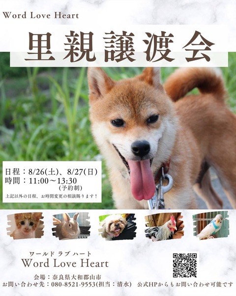 | イベント内容 | ワールドラブハートで里親募集中の動物たちの譲渡会を開催します! 犬猫だけではなく、インコやラット、ウサギにモルモットなどたくさんの保護動物がいます! みんな新しい家族を探しています。写真だけでは伝えきれない魅力が盛りだくさん! 実際に会ってそのかわいさを実感してください♪ ★里親募集中の動物たち★ https://satoya-boshu.net/foster/?@button_name@=search&FosterParent_MemberID=1161 ・犬、猫 ・ウサギ ・モルモット ・ファンシーラット ・スキニーラット ・インコ ・キンカチョウ ・ウコッケイ ・ヘビ ・カメ ……など 子犬や子猫もたくさんいますよ♡ ぜひお気軽にお越しください! ●混雑をさけるために、事前予約をお願いします。 予約番号080-8521-9553 ショートメールでも可♪ ●当日までに譲渡が決定した・体調がすぐれないなど、やむを得ない理由で不参加の場合があります。ご希望の子がいましたら、当日お問い合わせください。 ●当日、その場での引き渡しはしておりません。譲渡決定後、自宅訪問を兼ねてこちらからお届け致します。 ご来場お待ちしております♪ ★world love heart(ワールドラブハート)は、奈良県大和郡山市で活動している動物保護団体です。 『引き取り依頼は断らない』をモットーに、犬、猫、鶏、小動物、家畜、爬虫類など捨てられた動物を保護しています。 https://worldloveheart-nara.jimdofree.com |