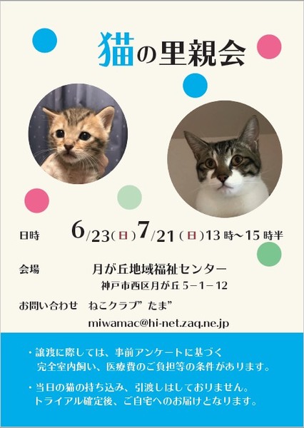 | イベント内容 | 場所 月が丘地域福祉センター 〒651-2217 神戸市西区月が丘5-1-12 無料駐車場完備 主催 ねこクラブたま 梅雨も明けて夏休みに入っています。 里親会には沢山の子猫が参加する予定です。 3か月に入って、カリカリを食べれてトイレもできるようになっています。 少しぐらいのお留守番もできるようになってきています。 性格や健康状態が落ち着いている大人猫さんも参加しています。 大人猫さんは長時間のお留守番も可能です。 里親さんの生活に合った猫さんをもらって下さい。 里親会で良いご縁があるよう願っています。 |