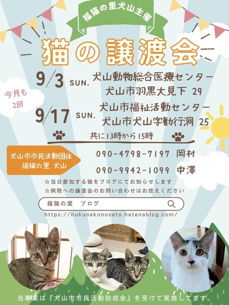 | イベント内容 | 【ココがポイント!】 ★ウイルスチェックなど健康診断済み! 20匹ほど参加予定です。 【日時】 9月17日(日)13~15時 【場所】 犬山市福祉活動センター (犬山市犬山字勧行洞25) 予約不要 広々駐車場あり 福猫の里 犬山「福猫の里便り」 https://hukunekonosato.hatenablog.com/ 問い合わせ先(福猫の里 犬山) a-saoka.922@outlook.com ーーーーーーーーー 【お約束】 当日、会場での猫の引き渡しはしておりません。 後日ご自宅までお届けします。 お試し飼育(トライアル)を1週間して頂き、双方が納得の上で正式譲渡となります。 譲渡の際は、医療費の一部の負担をお願いしております。(ワクチン代 等) ・ペット可のお住まい ・完全室内飼育、終生飼育 ・適切な医療措置 ・不妊手術の実施と報告等、お約束があります。 |