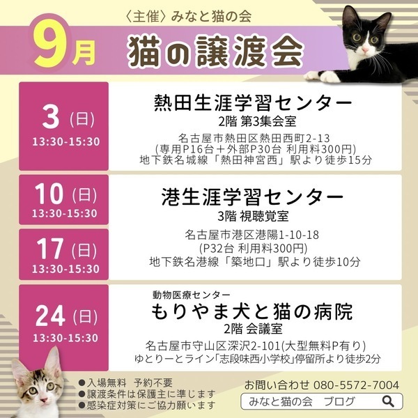 | イベント内容 | 子猫中心にたくさんのにゃんこが参加します 【ペットショップへ行く前にぜひ譲渡会へ】 名古屋市の登録ボランティアであり、多数の名古屋市動物愛護推進員が在籍中です 猫や譲渡についての質問にはベテランの愛護推進員がお答えいたします<(_ _)> ●会場は ・駐車場32台有(利用料300円) ・予約不要&入場無料 ●参加猫一覧 http://minatoneko2014.blog.fc2.com/blog-entry-1736.html ●参加猫は ・子猫も成猫も全頭ワクチン接種済 ・ノミダニ駆除済 ・トイレ躾済 ・ケージレストのトレーニング済 ●参加する猫たちについて 基本治療やトイレのしつけは済んでいます 足りないのは共に生きる新しい家族だけです 「譲渡会は行ったことがなくて不安…」 「猫を飼うのははじめて」 「今すぐじゃないけどいずれ猫と暮らしたい」 そんな皆様も大歓迎! ●譲渡に関して ※完全室内飼い・誓約書・治療費負担等の 諸条件があります。 ※譲渡やトライアルに関する契約条件は 猫の保護主によって異なります。 ●譲渡会その他についての問い合わせは みなと猫の会 minatonekonokai@gmail.com までお願いします。 ♪参加猫ちょこっと紹介 写真2枚目 てんちゃ ♀ 4ヶ月 ちょっぴりツンデレ気質のフワモコ女子 その他参加猫など詳しくは主催者ブログ ・みなと猫の会 ~こぴっと猫だより~ http://minatoneko2014.blog.fc2.com/ |