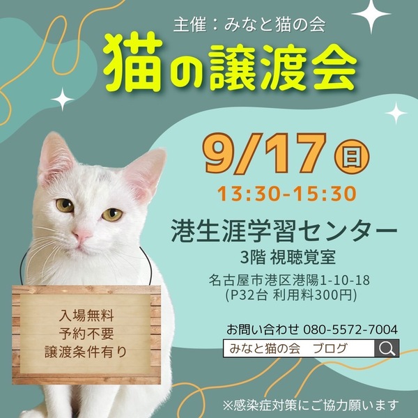 | イベント内容 | 子にゃんこもデカねこさんもやってくる! 【ペットショップへ行く前にぜひ譲渡会へ】 小さくてかわいい子猫も、落ち着いているおとな猫も、一緒に暮らしたらきっと楽しい♪ アナタのライフスタイルに合った猫とのくらしがあるはずです 猫とふれあいながらあなたの考える猫ライフをお聞かせください ●会場は ・駐車場32台有(利用料300円) ・予約不要&入場無料 ●参加猫一覧 http://minatoneko2014.blog.fc2.com/blog-entry-1737.html ●参加猫は ・子猫も成猫も全頭ワクチン接種済 ・ノミダニ駆除済 ・トイレ躾済 ・ケージレストのトレーニング済 ●参加する猫たちについて 基本治療やトイレのしつけは済んでいます 足りないのは共に生きる新しい家族だけです 「譲渡会は行ったことがなくて不安…」 「猫を飼うのははじめて」 「今すぐじゃないけどいずれ猫と暮らしたい」 そんな皆様も大歓迎! ●譲渡に関して ※完全室内飼い・誓約書・治療費負担等の 諸条件があります。 ※譲渡やトライアルに関する契約条件は 猫の保護主によって異なります。 ●譲渡会その他についての問い合わせは みなと猫の会 minatonekonokai@gmail.com までお願いします。 ♪参加猫ちょこっと紹介 写真2枚目 ダイヤ ♀ 4ヶ月 人見知りゼロの超スリゴロなパステル三毛女子 その他参加猫など詳しくは主催者ブログ ・みなと猫の会 ~こぴっと猫だより~ http://minatoneko2014.blog.fc2.com/ |