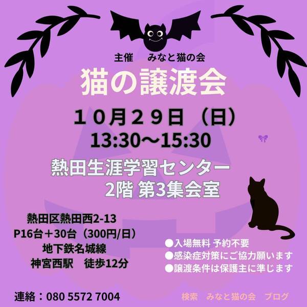 | イベント内容 | 家猫修行を終えた猫たちがずっとのお家を探しにやって来ます ◆ペットショップへ行く前にぜひ譲渡会へ◆ ”猫との暮らしをまた考えてみようかな” ”今いる猫さんのお友達を迎えるのは有りなのかな” そんな皆さまもお気軽に相談にお越しください ●会場は ・駐車場16台+30台有(利用料300円) ・予約不要&入場無料 ●参加猫一覧 http://minatoneko2014.blog.fc2.com/blog-entry-1744.html ●参加猫は ・子猫も成猫も全頭ワクチン接種済 ・ノミダニ駆除済 ・トイレ躾済 ・ケージレストのトレーニング済 ●参加する猫たちについて 基本治療やトイレのしつけは済んでいます 足りないのは共に生きる新しい家族だけです 「譲渡会は行ったことがなくて不安…」 「猫を飼うのははじめて」 「今すぐじゃないけどいずれ猫と暮らしたい」 そんな皆様も大歓迎! ●譲渡に関して ※完全室内飼い・誓約書・治療費負担等の 諸条件があります。 ※譲渡やトライアルに関する契約条件は 猫の保護主によって異なります。 ●譲渡会その他についての問い合わせは みなと猫の会 minatonekonokai@gmail.comもしくは 080-5572-7004 までお願いします。 ♪参加する子猫ちょこっと紹介 写真2枚目 かいと ♂ 4ヵ月 人が大好き! 後をついてトコトコと歩いてきます 他の参加猫の紹介など詳しくは下記ブログをご覧ください。 ◎主催者ブログ みなと猫の会 ~こぴっと猫だより~ http://minatoneko2014.blog.fc2.com/ |