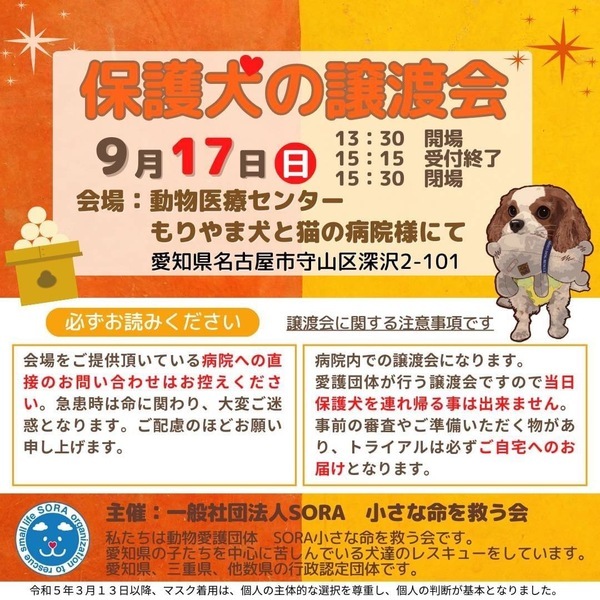 | イベント内容 | 保護犬の譲渡会を開催致します。 【注意】会場をご提供頂いている病院への直接のお問い合わせはお控えください。 急患時は命に関わり、大変ご迷惑となります。 ご配慮のほどお願い申し上げます。 もりやま犬と猫の病院さま 2階会議室 〒463-0811 名古屋市守山区深沢2-101 《ご注意》 家族希望ワンコがいる場合のお見合いに限定させていただきます。 事前のお申込みは不要です。保護活動ブログで、開催日の数日前に譲渡会参加が決定したワンコたちのご案内もしておりますので、ご希望のワンコの参加をご確認してお越し頂けますと幸いです。 なお、新型コロナウィルス感染拡大の状況におきまして、中止させていただくこともございますのでご了承下さい。 SORA公式ホームページ https://sora-chiisana.org/foster/ SORA公式活動メインブログ https://ameblo.jp/sora-chiisana-inochi/ SORAイベントブログ https://ameblo.jp/sora-charity-events/ |