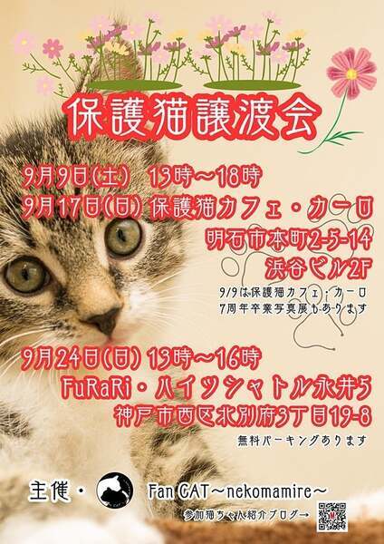 | イベント内容 | 猫の譲渡会 2023年9月24日(日)13時~16時(※お時間お間違えなく) 神戸市西区北別府3丁目19-8 Fu・Ra・Ri(igawadani7 ハイツシャトル永井5) https://goo.gl/maps/Cq15cEHSiWqmYVC8A Fu・Ra・Ri(ikawadani7)無料パーキングあります 子猫がたくさん参加しています! 中猫さん大人猫も参加していますので是非ご参加ください!! 参加の猫ちゃんたちはブログにて掲載しています https://mycatkobe.blog.fc2.com/ お見合いしたいと思われる方は、ブログのメールフォーム、InstagramのDMより お越しになる時間をご連絡ください ※譲渡は無料ではございません(譲渡会参加は無料です) ※譲渡条件がございます ※当日連れて帰れません ※※早い順ではございませんがご縁があれば早くに決まってしまう 場合がありますのでお見合いの予約かお早めにご来場ください 主催 Fan CAT~nekomamire~ |
