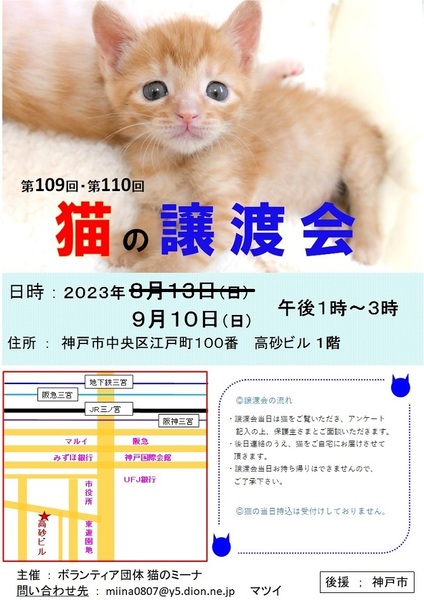 | イベント内容 | たくさんの猫、大人も子猫も参加する譲渡会です。 猫たちが幸せになるために、新しいお家を求めて参加します(=^・^=) 猫は後日こちらからお届けをさせて頂き、お家の環境を見せて頂ければと思います。 仔猫は20年くらい生きる子もいますので、ご自身の年齢に合った猫さんとの出会いを探しに来てください。 ペット不可にお住まいの方はご遠慮ください!(ご確認してください。) 譲渡には条件が多数ありますので、ご理解くださいませ<m(__)m>。 まずはお試しで猫との相性を見てから、正式譲渡となります。 また、猫を保護して里親を探そうと思われている方も、〖参加猫の募集〗をしていますので、お申し込みくださいね! アドレス miina0807@y5.dion.ne.jp にご連絡をください。 お越しの際は各路線の三宮駅からは徒歩10分くらい、車でお越しの場合は近隣のコインパーキングなどにお停めください。 当日、体調の悪い方、発熱がある方、このような方はご遠慮ください。 定例の毎月は第2日曜日に譲渡会を開催しておりますので、次回の出会いに期待をしてくださいね。 ブログ: 猫のミーナといっしょ http://miina300.blog.fc2.com/ ねこのオカン https://ameblo.jp/miina300/ |