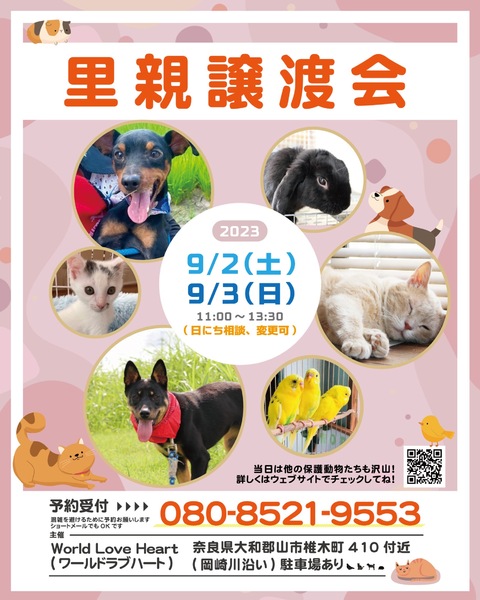 | イベント内容 | ワールドラブハートで里親募集中の動物たちの譲渡会を開催します! 犬猫だけではなく、インコやラット、ウサギにモルモットなどたくさんの保護動物がいます! みんな新しい家族を探しています。写真だけでは伝えきれない魅力が盛りだくさん! 実際に会ってそのかわいさを実感してください♪ ★里親募集中の動物たち★ https://satoya-boshu.net/foster/?@button_name@=search&FosterParent_MemberID=1161 ・犬、猫 ・ウサギ ・モルモット ・ファンシーラット ・スキニーラット ・インコ ・キンカチョウ ・ウコッケイ ・ヘビ ・カメ ……など 子犬や子猫もたくさんいますよ♡ ぜひお気軽にお越しください! ●混雑をさけるために、事前予約をお願いします。 予約番号080-8521-9553 ショートメールでも可♪ ●当日までに譲渡が決定した・体調がすぐれないなど、やむを得ない理由で不参加の場合があります。ご希望の子がいましたら、当日お問い合わせください。 ●当日、その場での引き渡しはしておりません。譲渡決定後、自宅訪問を兼ねてこちらからお届け致します。 ご来場お待ちしております♪ ★world love heart(ワールドラブハート)は、奈良県大和郡山市で活動している動物保護団体です。 『引き取り依頼は断らない』をモットーに、犬、猫、鶏、小動物、家畜、爬虫類など捨てられた動物を保護しています。 https://worldloveheart-nara.jimdofree.com |