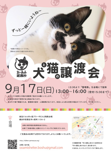 | イベント内容 | ☆★☆★☆★☆★☆★☆★☆★☆★☆★☆★☆ ~9月17日(日)市が尾にて譲渡会開催!~ ◎場所・・「東急ドエル市ヶ尾プラーザビル2階集会場」 神奈川県横浜市青葉区市ヶ尾町1154-2 田園都市線「市が尾」駅西口より徒歩約2分 ◎日程・・9月17日(日)(雨天決行) ◎時間・・13時00分から16時00分(受付は15時30分まで) (会場に利用可能な駐車場はございません。近隣のコインパーキングをご利用ください。) *12:45よりも前の時間いお待ちいただくことはできません。 *混雑状況により、入場制限をさせていただく場合がございます。 *参加の際は、マスクの着用、アルコール消毒のご協力をお願いいたします。 *当日は検温の上、体温が37度以上の方はご参加いただけません。 ※参加予定の犬猫は体調により参加できない場合があります。ご了承ください。 ☆★☆★☆★☆★☆★☆★☆★☆★☆★☆★☆ |