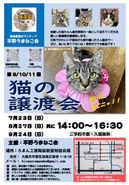 | イベント内容 | 「第11回平野ろまねこ譲渡会」を開催致します。 かわいい子猫から落ち着いた大人猫までが参加します! ベテランの保護主が、参加猫達のケアや人馴れ修業を施して皆様とのご縁をお待ちしています! ご予約不要・入場無料です。 見学だけでも歓迎致します。 皆様のお越しをお待ちしております! (会場ではマスク着用と手指の消毒をお願いします。無料のマスクのご用意もあります。譲渡は各保護主により譲渡条件が異なります。会場でスタッフにおたずね下さい。) ●JR平野駅北出口下車、東へ徒歩6分 ●お車では近隣のコインパーキングをご利用下さい。 ●活動インスタグラム https://www.instagram.com/romanekokai/ ●譲渡会参加猫インスタグラム https://www.instagram.com/romaneko_jyotokai/ ●メール hiranoromaneko@gmail.com |