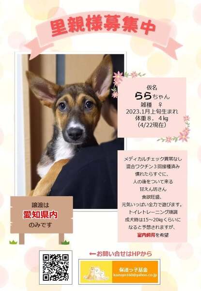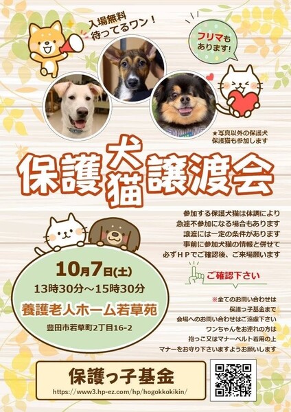 | イベント内容 | 豊田市にて 室内の 保護猫犬の譲渡会です。フリーマーケットも開催します!! 予約は不要です。 ★里親希望者はボールペンをお持ち下さい。 ※[ 保護っ子基金 ] で 必ずホームページを検索して 条件などを 確認のうえ、ご来場願います。 http://www3.hp-ez.com/hp/hogokkokikin ●猫 どんな猫が参加するのかは 当日楽しみにしていてください。 猫のお問い合わせ https://ameblo.jp/sobolo777/ ブログ「毎日にゃんず」で検索でもOKです。 ねこの歩添道(ねこのほそみち) ●犬 現在は5匹の犬が 参加予定でございます。 犬の毎日の様子は 各 預かりのブログなどを ご確認ください。 当日の変更点や 参加犬について 当日の朝 9時以降 必ず確認の上、 ご来場ください。 また犬猫の ご不明な点が ございましたら10月5日までに ご質問ください。よろしくお願い致します。 |