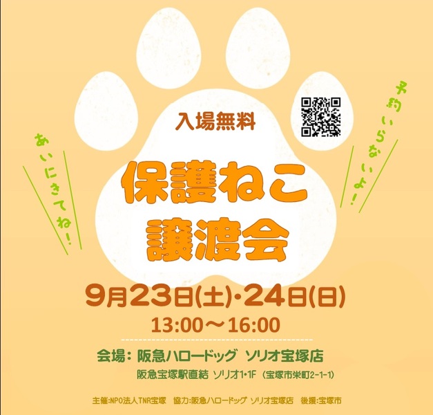 | イベント内容 | 保護ねこ譲渡会 at 阪急ハロードッグ宝塚 https://ameblo.jp/takarazuka-tnr/ 様々な理由で行き場を失った猫達が、家族との出会いを心待ちにしています。 阪急ハロードッグ CAT FESTIVALとのコラボ開催です。 皆様のお越しをお待ちしています。 【日時】 2023年9月23日(土) ・24日(日) 各日とも13:00~16:00(最終受付15:30) 【場所】 阪急ハロードッグ・ソリオ宝塚店内 阪急宝塚駅直結 ・ JR宝塚駅 徒歩2分 【予約不要】 直接会場へお越し下さい。 【ご注意事項】 必ずご一読下さい。 ※ 譲渡は先着順ではありません! 2日間ですべての方の見学が終わってから 猫達にいちばん合う里親様を決定させて頂きます。 ※13時~14時はかなり込み合います。先着順ではないので時間をずらして来場下さい。 【主催】 特定非営利活動法人 TNR宝塚 【協力】 阪急ハロードッグ ソリオ宝塚店/ペットアダプションセンター宝塚 【後援】 宝塚市 |